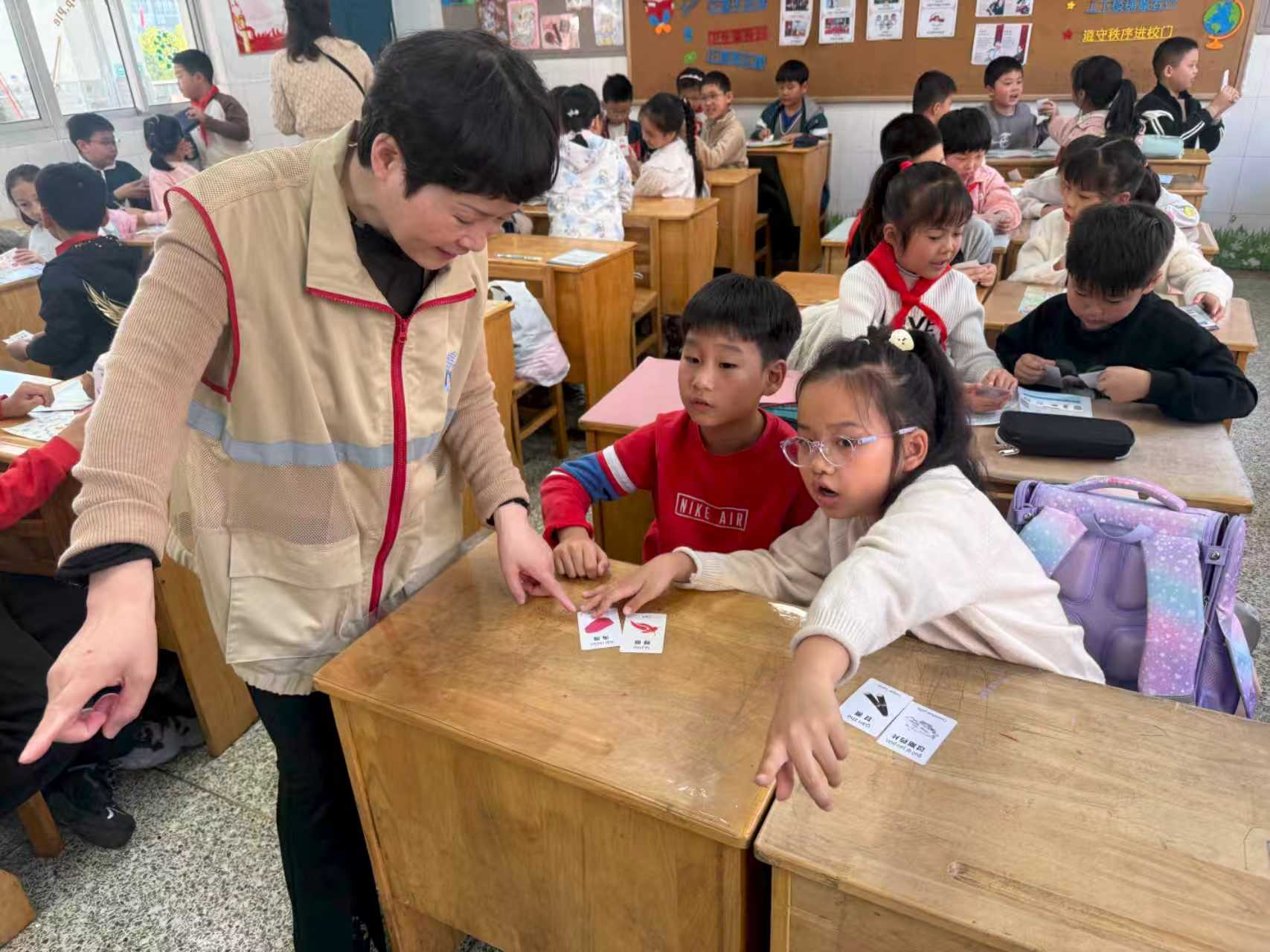 活动现场,三(1)班孩子们首先观看了生动有趣的垃圾分类动画视频。在互动问答环节,社区志愿者通过实物演示,引导孩子们辨认不同垃圾的类别。“我知道!过期药品是有害垃圾!”大家争相举手、踊跃参与。随后,志愿者为学生们发放并讲解了《垃圾分类手册》,通过图文并茂的形式帮助孩子们巩固所学知识。在模拟分类环节,学生们亲手进行垃圾分类清理,兴奋地说,“我要把今天学到的知识教给爸爸妈妈”。