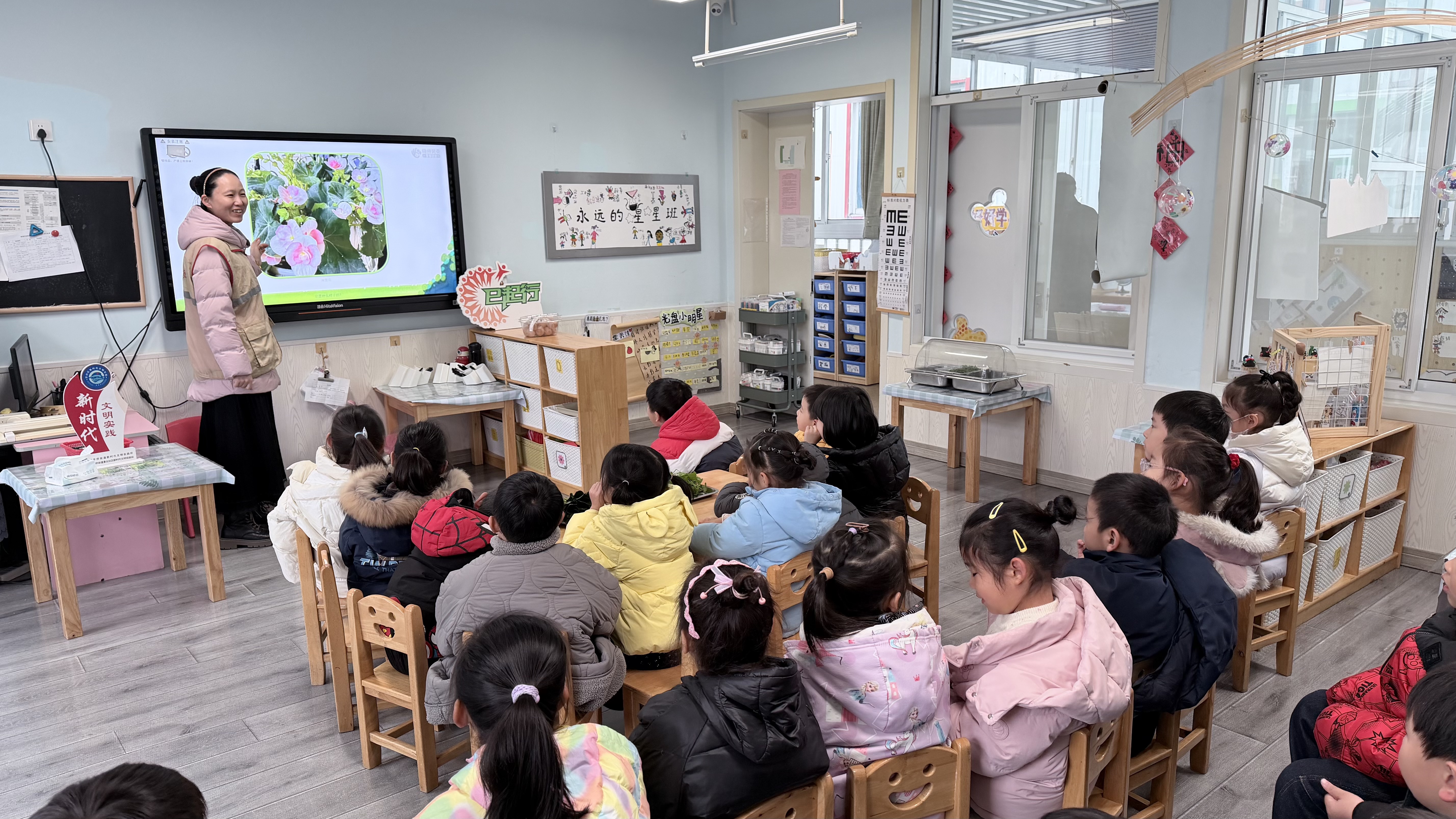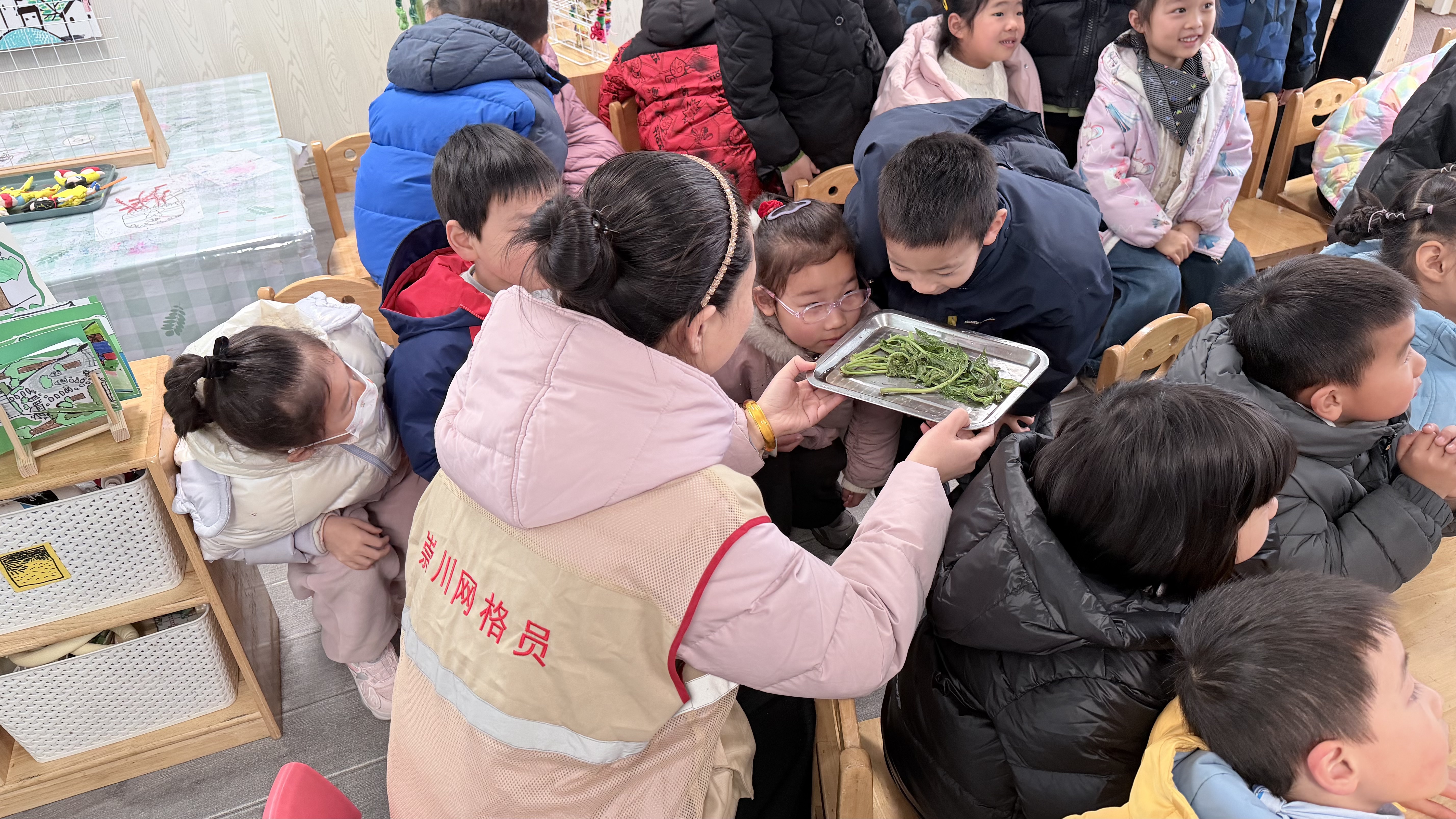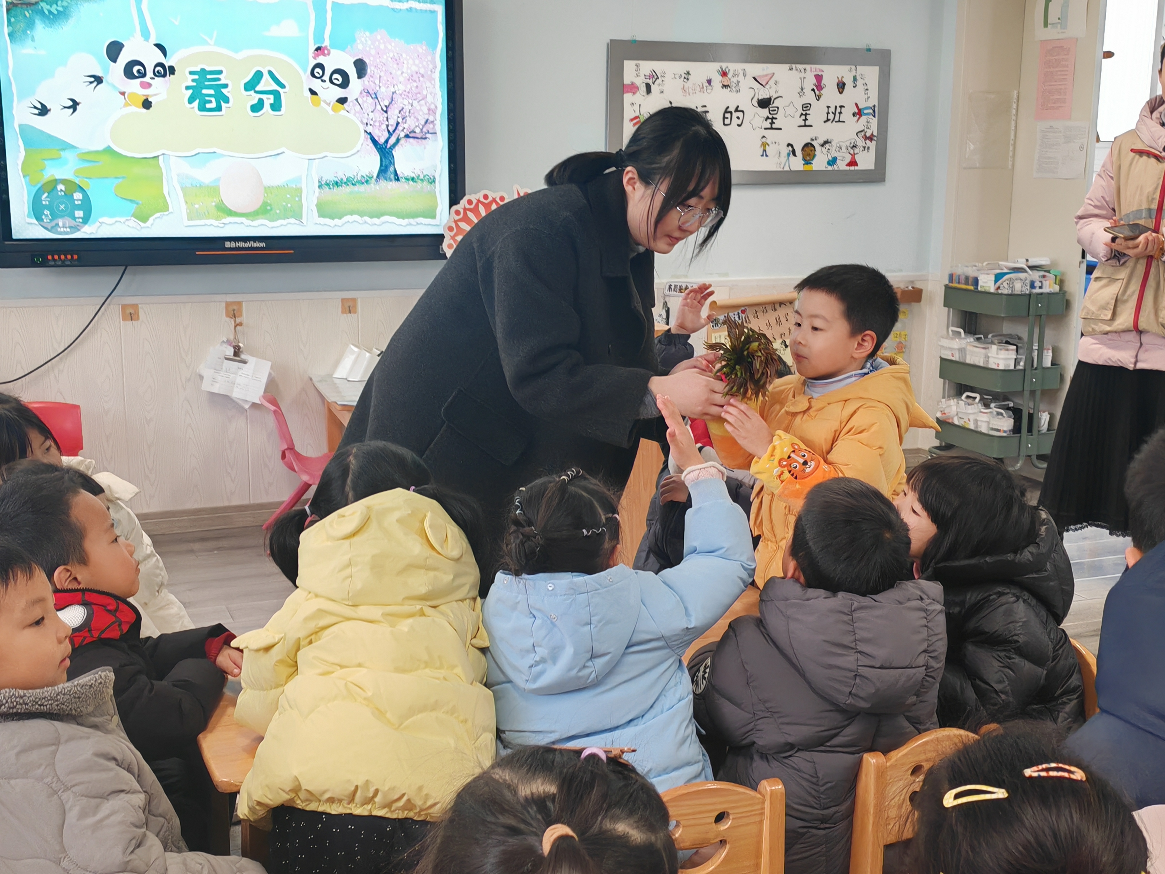 活动在热闹的舞龙表演中正式开始。舞龙队在操场翻腾起舞,孩子们欢呼雀跃,以最直观热烈的方式迎接“龙爷爷”醒来,感受传统文化的强大生命力。在“节气小课堂”环节,老师用生动语言向孩子们介绍双节重合的独特意义:“今天太阳公公把白天和黑夜分得一样长,龙爷爷也醒来啦!”荠菜、香椿、菠菜等春菜实物展示,让孩子们通过观察认识春天的馈赠。