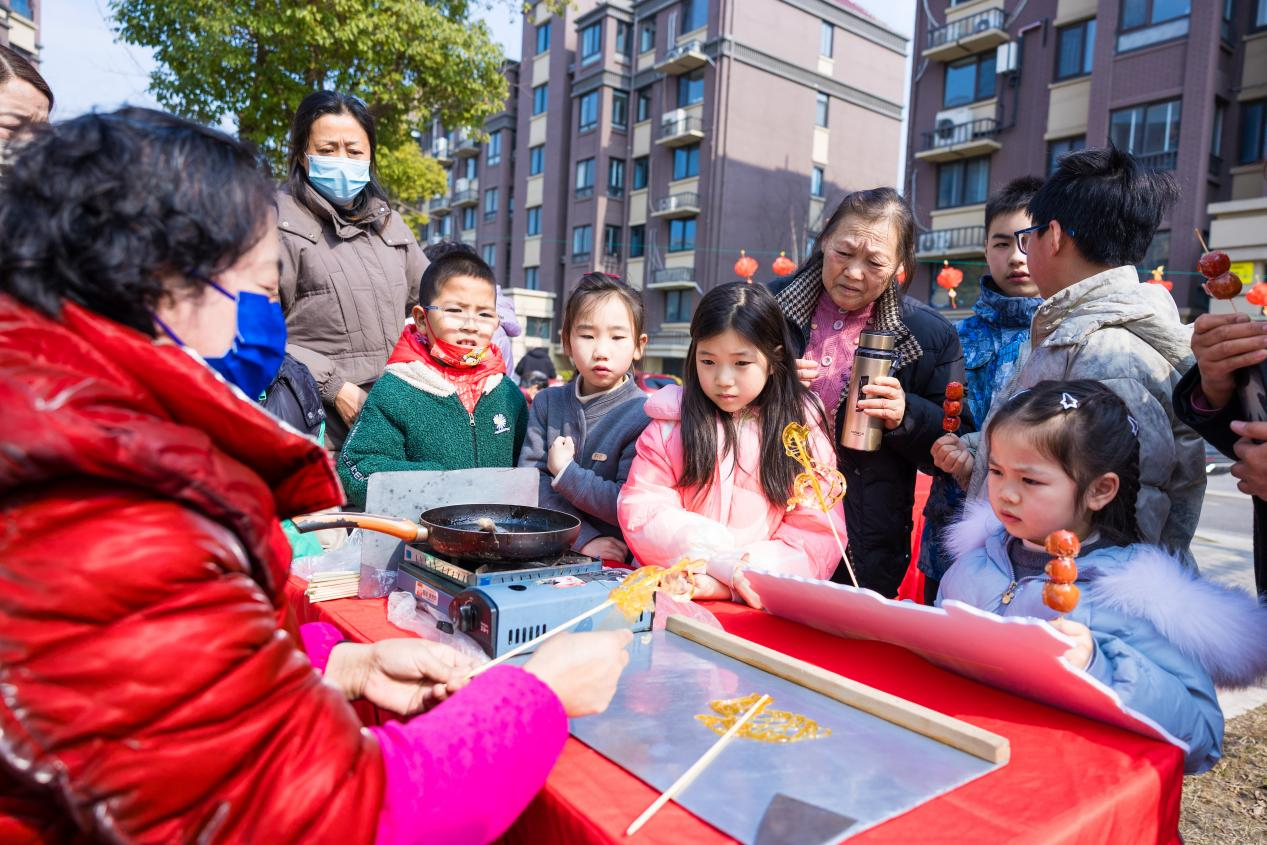 江畔灯飨市集,舌尖上的非遗盛宴。“元夕甜韵”摊位前,旋转的棉花糖机吐出云朵般的糖丝,孩子们踮脚张望,接过如梦似幻的粉色“云朵”;隔壁“灯宵糖语”区域,红彤彤的山楂裹上琥珀色糖衣,酸甜交织的滋味引得路人驻足品尝;“糯香灯辉”展台处,非遗烘糕传承人翻动金黄米糕,酥脆声响伴着谷物香气,唤醒记忆中的年味。更有“糖映花灯”的糖画艺人以糖为墨,在青石板上勾勒出灵动生肖,引得阵阵喝彩;“宵甜醴暖”区则贴心准备了热气腾腾的酒酿元宵,为料峭春寒添一份甜蜜。