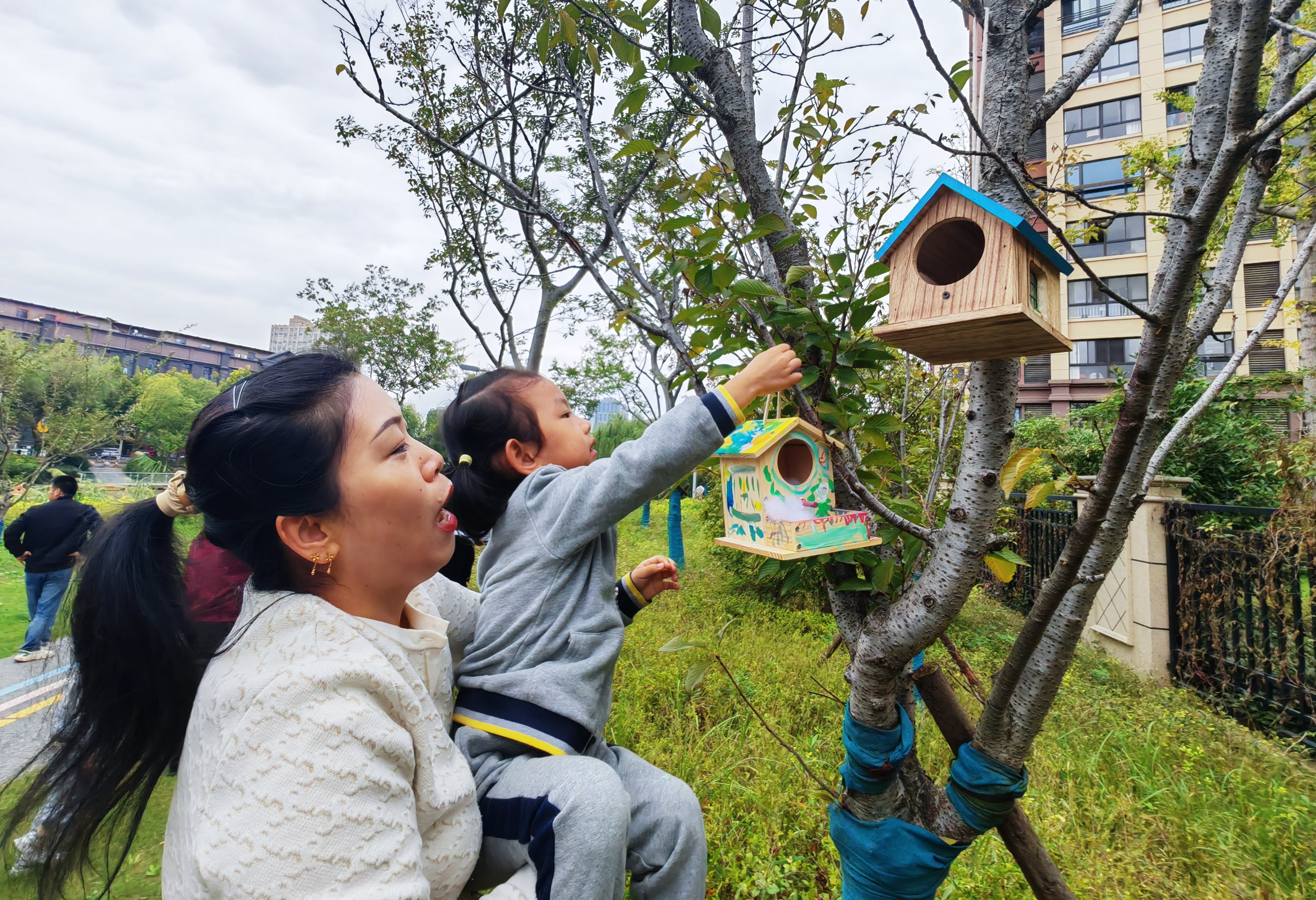 活动现场,家长与孩子们纷纷化身“小小工匠”,在志愿者们的耐心指导下,开启了奇妙的创作之旅。他们利用预先准备好的环保材料,相互配合,专注地搭建着一个个充满爱心与巧思的鸟巢。“这里要用小木棍固定得更牢一些,这样小鸟的家才结实!”一位妈妈一边动手一边轻声指导着孩子。孩子们则兴奋地递上材料,或用小手小心翼翼地调整着结构,眼中充满了对完成作品的期待。锯木、拼接、固定、装饰……每一个步骤都凝聚着亲子间的默契与合作,现场洋溢着温馨与忙碌的氛围。鸟巢制作完成后,大家共同前往附近的河道公园,为这些亲手打造的“爱心小屋”选址安家。在志愿者的带领下,亲子家庭仔细观察树木的高度、枝干的稳固性以及周围环境,慎重地为小鸟选择安全、适宜的“住所”。家长们负责将鸟巢稳妥地固定在选定的树枝上,孩子们则在一旁加油鼓劲,并许下守护小鸟、爱护自然的美好心愿。看着一个个凝聚着匠心与关爱的鸟巢在公园的绿意中“落户”,孩子们的脸上绽放出灿烂的笑容,这份手作的温暖终于在大自然中落地生根。