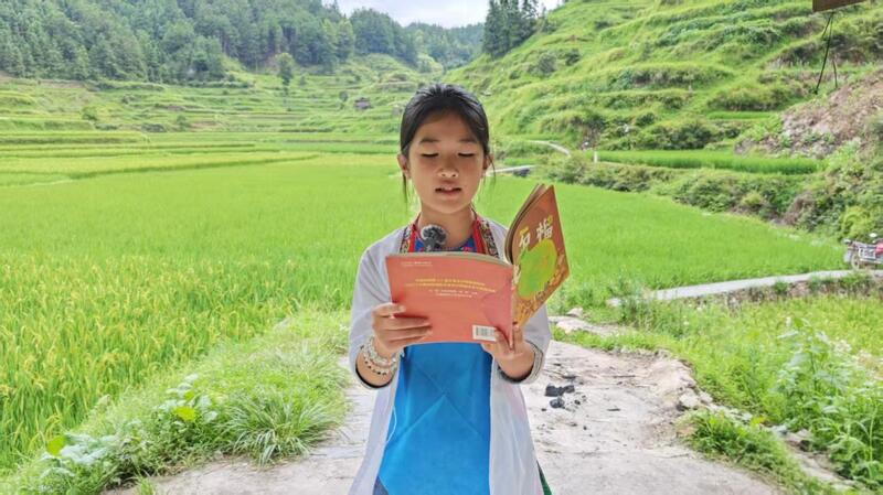 初秋的侗寨,稻浪轻摇,鸟鸣啁啾,在小黄村的梯田上,梯田上的读书会正在开展,二十余名侗娃在欣欣然亲子俱乐部负责人、江苏省全民阅读推广人周玉暄老师的带领下,手捧书本专注阅读。“《慢石榴》和孩子们一样,成长是个漫长的过程,只要坚持就会成功。”周老师向孩子们分享绘本《慢石榴》。孩子们通过自主阅读、片段朗读、绘本句接力赛等形式,以自然为卷,感受着阅读的乐趣。此时,书香和泥土的芬芳融合,朗朗读书声与风吹稻浪声交织,构成了一幅充满诗意的画卷。