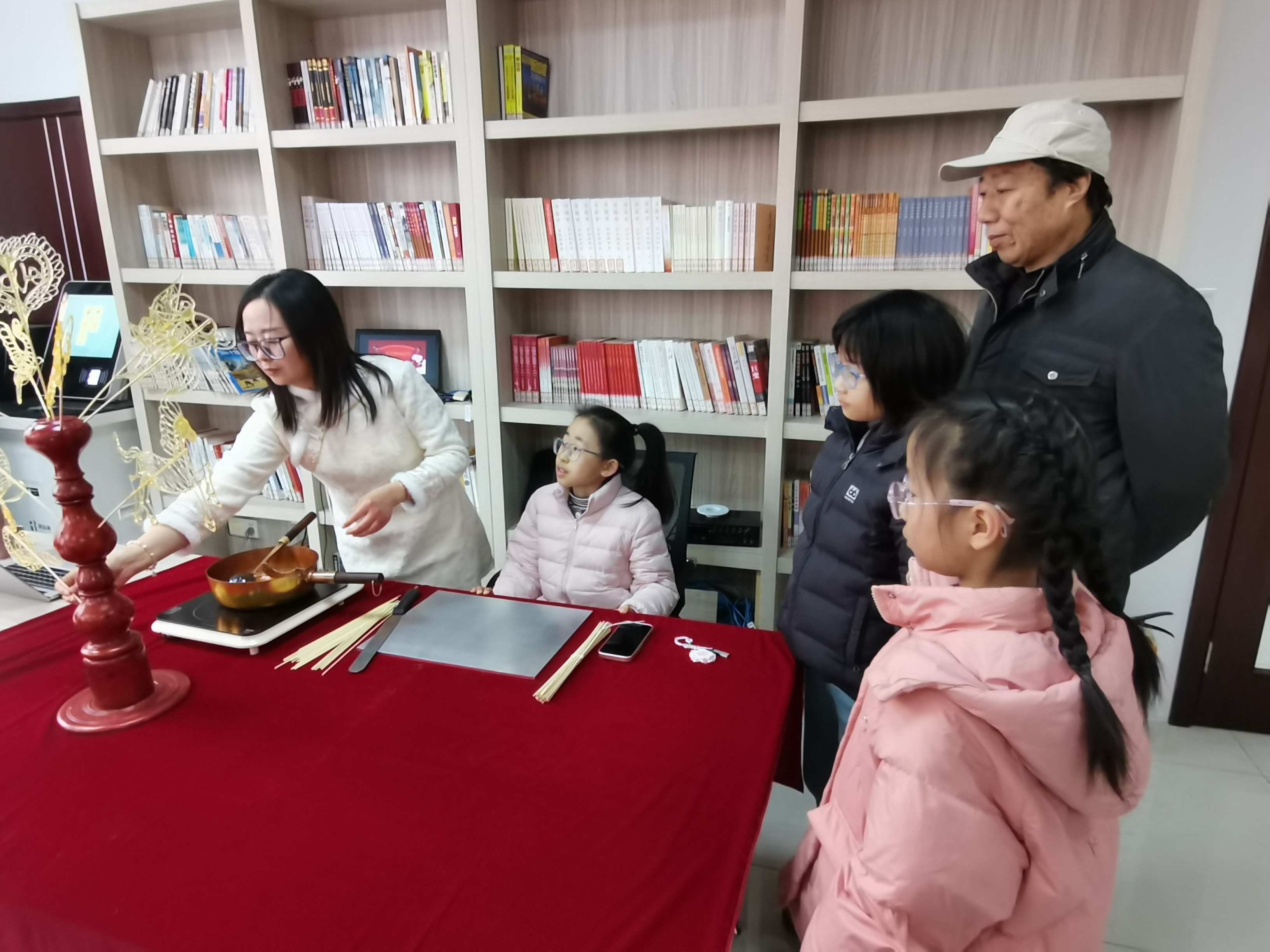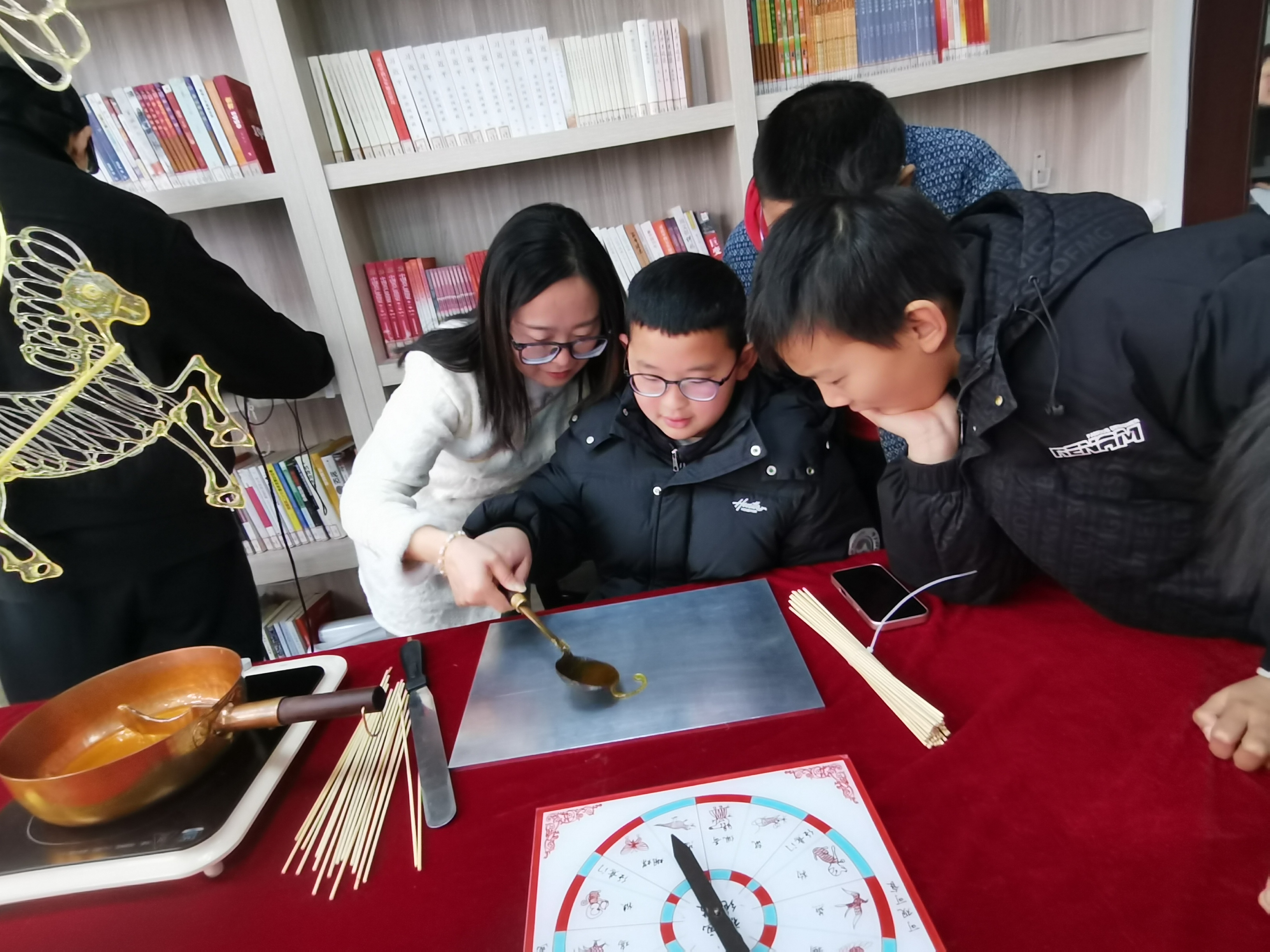 活动中,“春风沐书香”环节在书房温馨的氛围里缓缓启幕。孩子们在志愿者引导下围坐成圈,手捧春节主题绘本共读,分享趣味盎然的年俗故事,在氤氲的书香中沉浸式体悟传统文化的深厚魅力。另一侧的“糖韵承非遗”体验区则充满欢声笑语:非遗传承人手把手教授糖画技艺,从熔糖时的滋滋作响、勾线时的凝神屏息,到作品成型时的欢呼雀跃,小朋友们专注创作属于自己的“甜蜜艺术品”,在亲手实践中深刻领略非遗技艺的独特精妙。